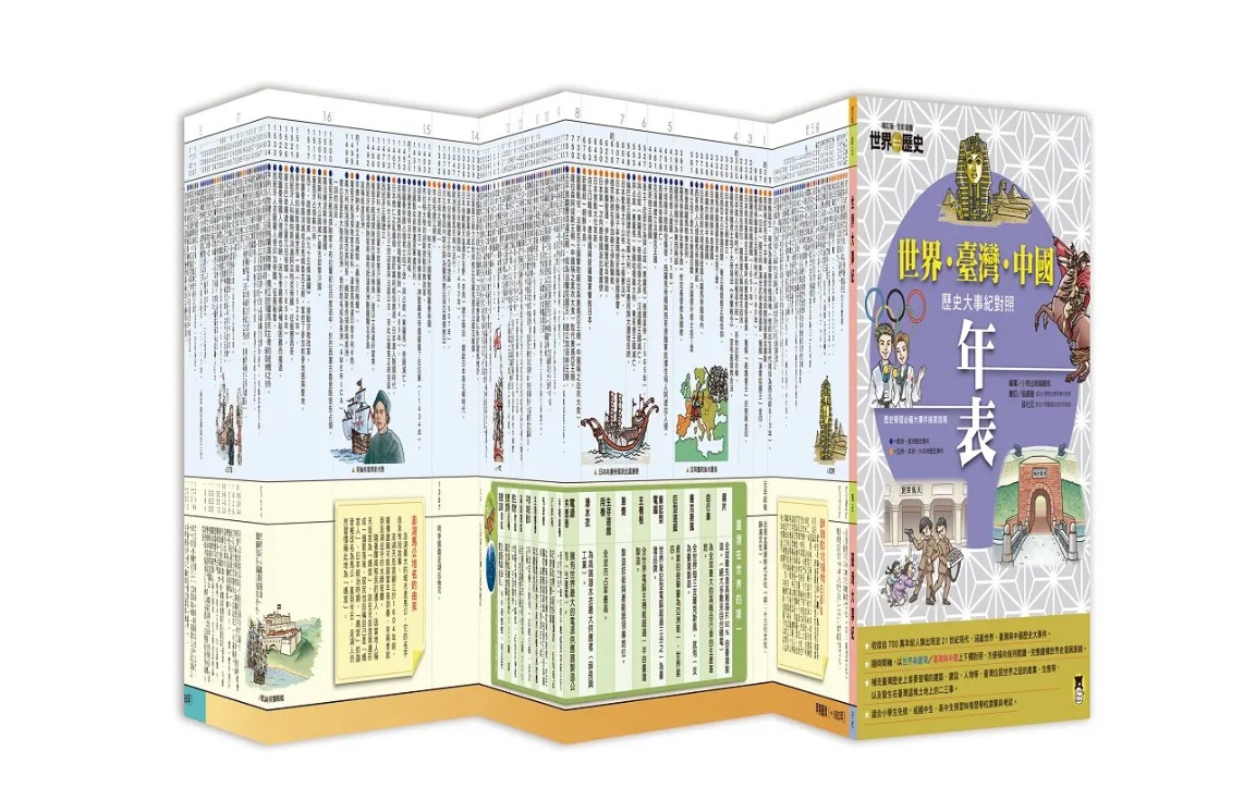 《世界.臺灣.中國歷史大事紀對照年表》是小熊出版編輯部專為《增訂版全彩漫畫世界歷史》(全13卷)的臺灣讀者編製的別冊,並且特別邀請國立成功大學歷史學系專任教授翁嘉聲和國立政治大學臺灣史研究所教授薛化元共同審訂;全冊以雙面彩色印刷、書經摺拉頁裝訂,一眼就能檢索臺灣史大事件發生的先後順序,以及與世界史大事件連動的關係。內容囊括: