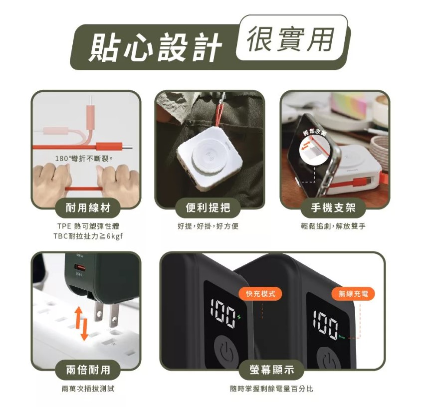 自帶AC插座、便利提把、橫置手機支架、USB-C to Lightninig創意轉接頭