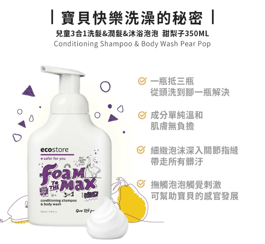 連假特惠!(甜梨子)【ecostore宜可誠】兒童三合一洗髮&潤髮&沐浴泡泡慕斯350ml (溫和親膚配方)