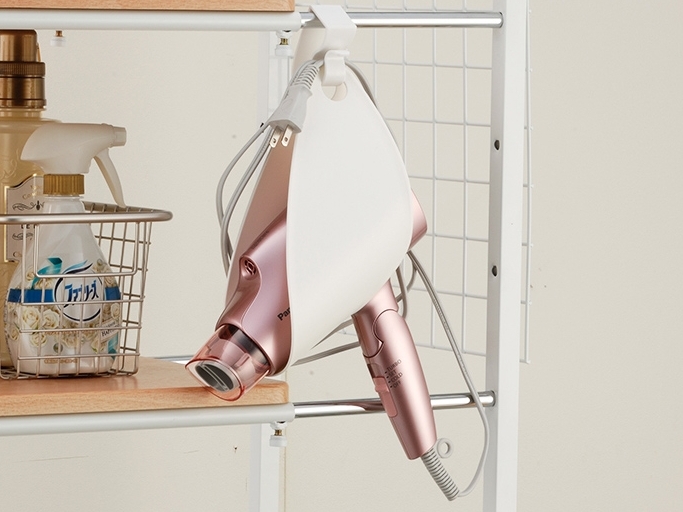 適合放置吹風機的便利掛夾‧附有可以掛於洗手台或是門把上的掛鉤‧可以橫置收納或直立收納