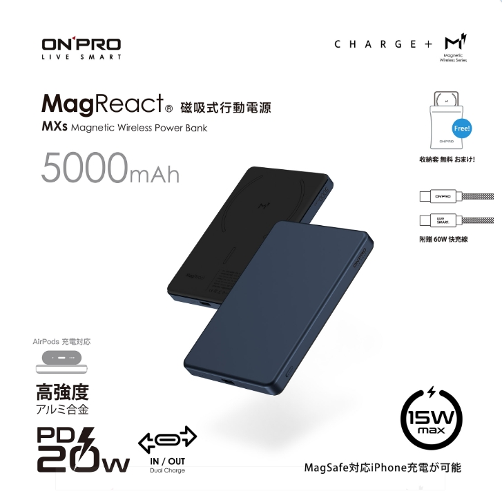 (藍鈦) 【ONPRO】 MagReact™ MXs 超薄型磁吸無線行動電源