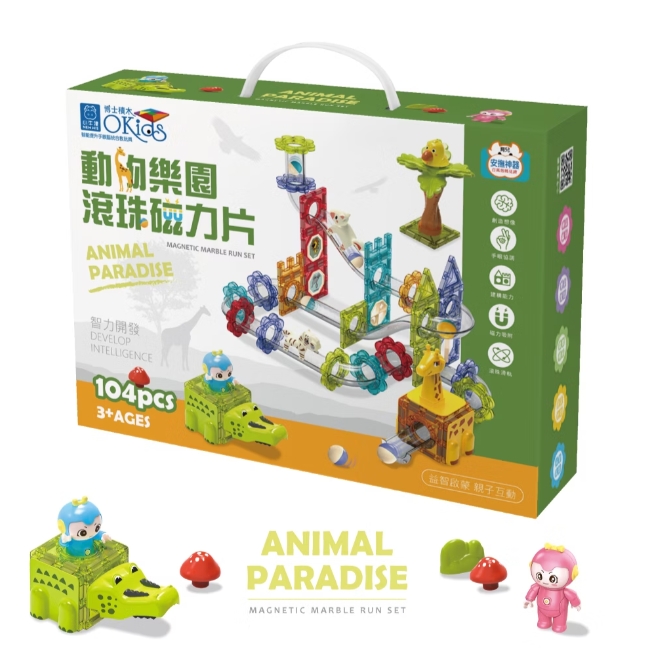 104pcs【Okids博士積木】動物樂園滾珠磁力片(滾珠軌道/造型磁力片/動物造景玩具)