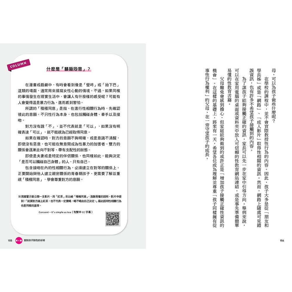 本書中除了以漫畫圖解的形式呈現多種家庭中可能遇到的「性教育場景」,更收錄超過30道性教育必修題,包含積極同意、月經貧窮、LGBT與SOGI、社群規範……等,囊括青春期孩子可能遇到的多種社會議題,讓性教育不僅止於談論性行為,更是讓孩子在成長過程中學習尊重他人以及保護自己,預防孩子成為性犯罪的加害者或被害者,並體認到生命的可貴與多樣性。